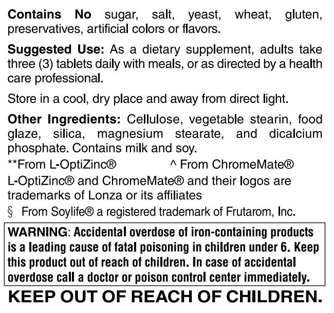 Other Ingredients: Cellulose, vegetable stearin, food glaze, silica, magnesium stearate, and dicalcium phosphate. Contains milk and soy.