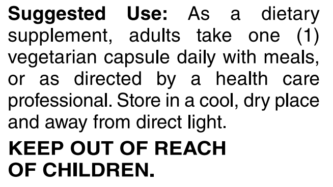 Suggested Use: As a dietary supplement, adults take one (1) vegetarian capsule daily with meals, or as directed by a health care professional. Store in a cool, dry place and away from direct light.