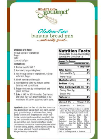 Ingredients: gluten free flour mix (rice flour, brown riche flour, potato starch, tapioca starch, corn starch, xanthan gum), granulated sugar, dried banana flakes, baking powder (sodium side pyrophosphate, sodium bicarbonate, cornstarch and mono calcium phosphate), baking soda (sodium bicarbonate, tricalcium phosphate), sea salt, xanthin gum, natural banana flavor powder (with dextrose, corn starch, tricalcium phosphate {added to prevent caking},a alcohol), non fat dry milk (nonfat dry milk, lactose, vitamin A Palmitate and vitamin D)