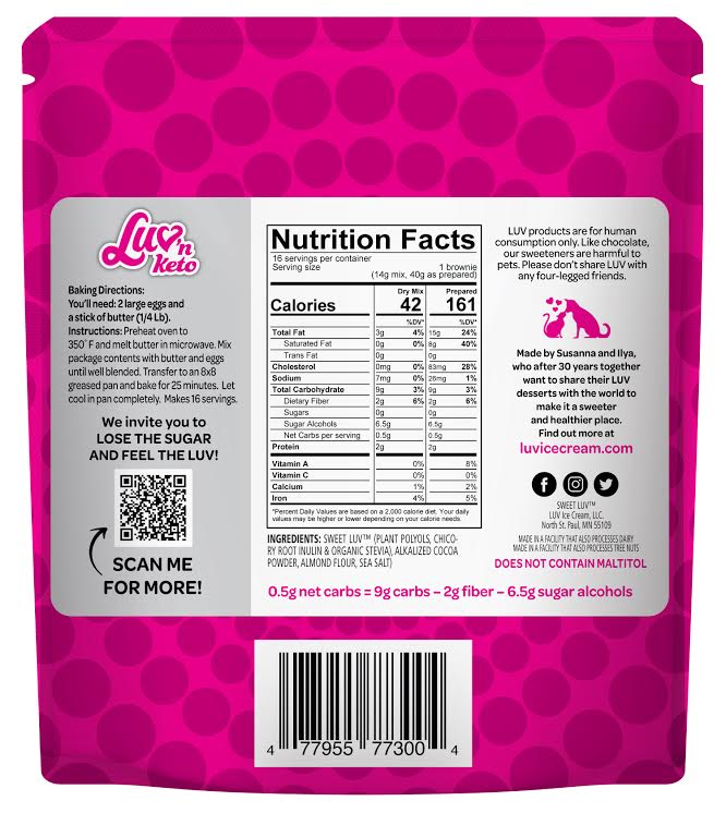 Ingredients: Sweet LUV(TM) (plant polyols, chicory root inulin, organic stevia), alkalized coca powder, almond flour, sea salt.