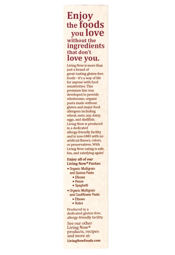 With Living Now® Gluten-Free Organic Multigrain and Cauliflower Elbows Pasta you and your family can enjoy pasta dishes without wheat, corn, soy, and other allergens.
