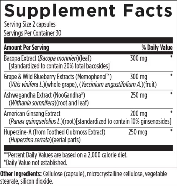 CogniAid™ combines grape and wild blueberry extracts with huperzine-A, bacopa, American ginseng, and ashwagandha to support overall brain health, memory, and learning.* Huperzine-A helps maintain healthy acetylcholine status, while the botanicals promote antioxidant status and healthy inflammatory responses.* Bacopa, ashwagandha, and American ginseng further promote cognitive function and neuronal health.*