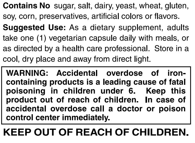 Suggested Use: As a dietary supplement, adults take one (1) capsule daily with meals, or as directed by a health care professional. Store in a cool, dry place and away from direct light.