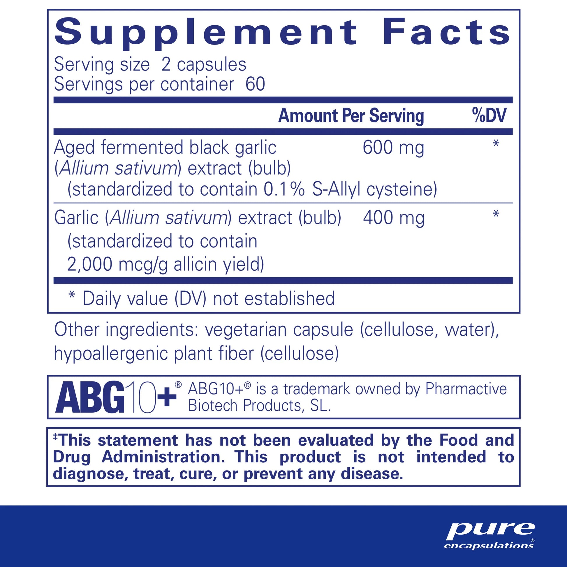 Our Garlic Complex supplement provides a unique combination of aged fermented black garlic extract and garlic extract, while reducing the odor and sharp taste typically associated with raw garlic and garlic extracts. This combination offers heart and immune support, specifically broad-spectrum cardiovascular health, including support for healthy blood flow and platelet function, and arterial function along with the healthy breakdown of fats.. In addition, Garlic Complex provides support for maintaining a healthy gut and promoting immune system function.‡