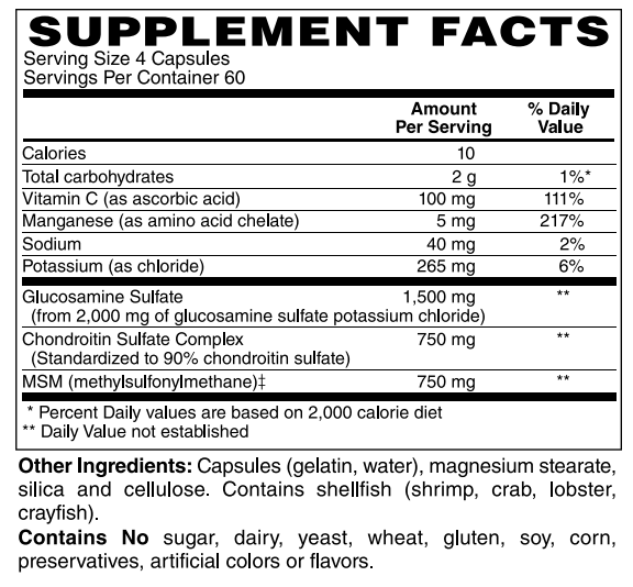 • Clinically effective doses of glucosamine/chondroitin sulfate and MSM.