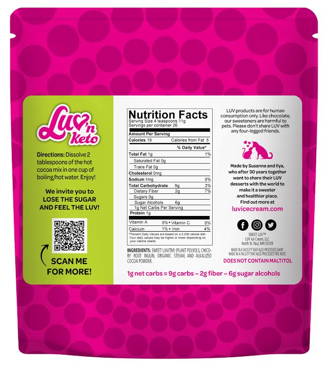 Ingredients: Sweet LUV(TM) (plant polyols, chicory root inulin, organic stevia) and alkalized coca powder.