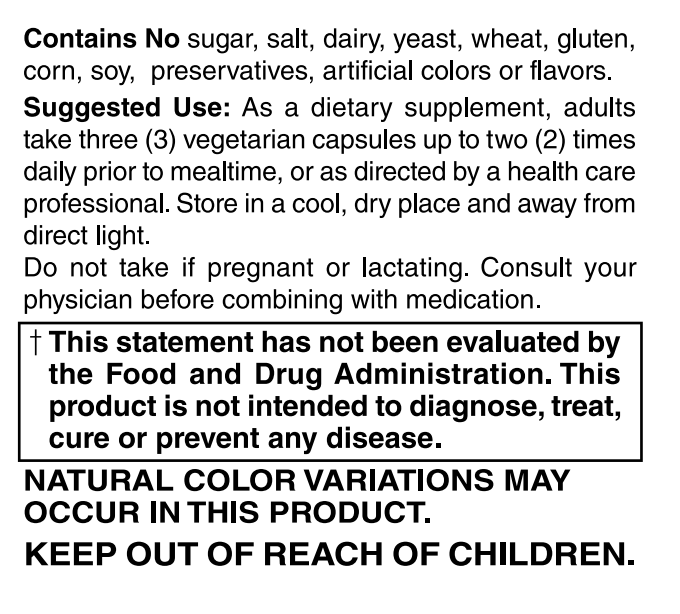 Suggested Use: As a dietary supplement, adults take three (3) vegetarian capsules up to two (2) times daily prior to mealtime, or as directed by a health care professional. Store in a cool, dry place and away from direct light. Do not take if pregnant or lactating. Consult your physician before combining with medication. KEEP OUT OF REACH OF CHILDREN.