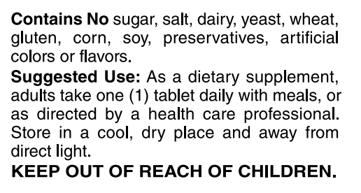 Suggested Use: As a dietary supplement, adults take one (1) tablet daily with meals or as directed by a healthcare professional.  Store in a cool, dry place, and away from direct light