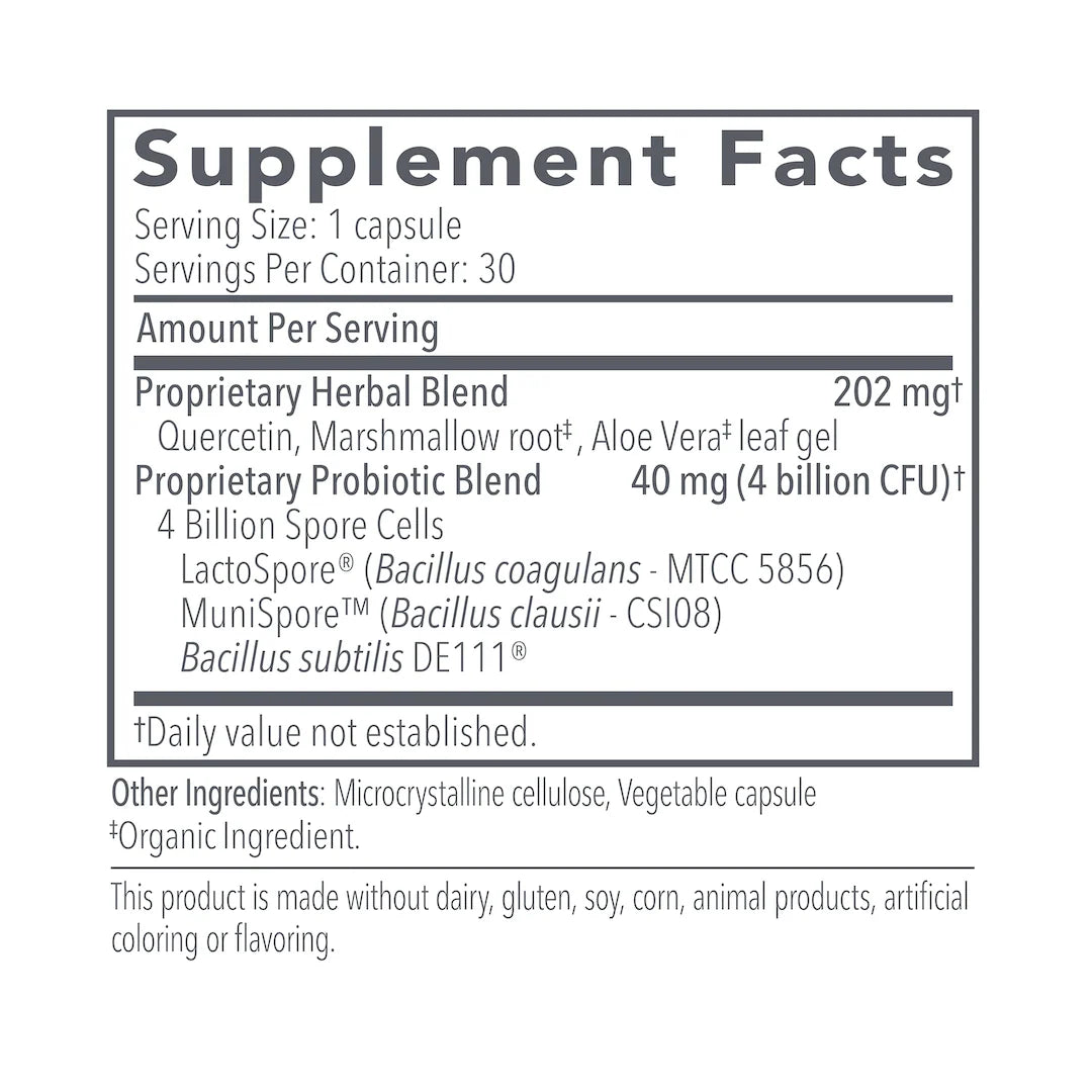 Support your gut with Proflora 4R, a powerful probiotic and herbal blend. Each capsule combines three spore-forming Bacillus strains with marshmallow root, aloe vera, and quercetin to promote digestive comfort, nutrient absorption, microbial balance, and immune health.* Shelf-stable and effective, it survives stomach acid and supports a healthy gut even alongside antibiotics.*