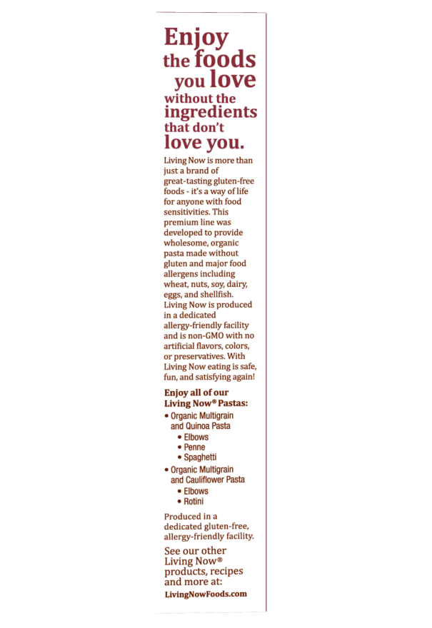 Living Now is more than just a brand of great-tasting gluten-free foods - it’s a way of life for anyone with food sensitivities. This premium line was developed to provide wholesome, organic pasta made without gluten and major food allergens including wheat, nuts, soy, dairy, eggs, and shellfish. Living Now is produced in a dedicated allergy-friendly facility and is non-GMO with no artificial flavors, colors, or preservatives. With Living Now eating is safe, fun, and satisfying again!