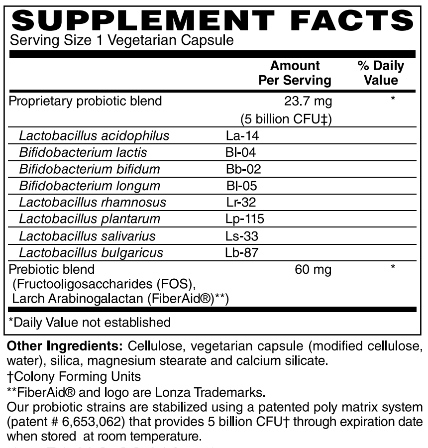 7. The prebiotic blend consists of FOS (food source for probiotics), and FiberAid® arabinogalactans (patented prebiotic from Lonza®) to help support the growth of probiotics.