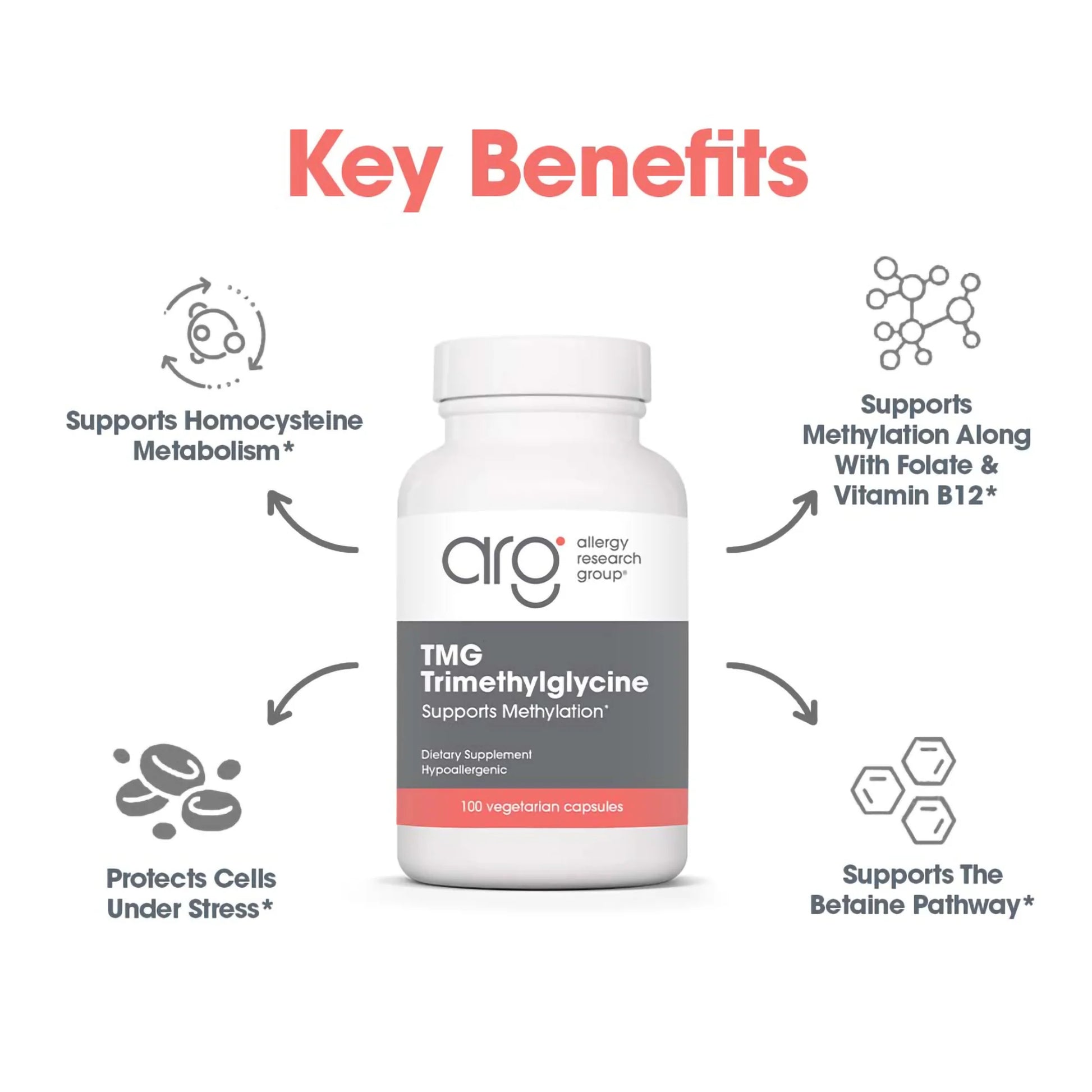 Trimethylglycine (TMG) supports methylation, liver health, and homocysteine metabolism while acting as a cellular osmolyte for stress resilience.* TMG assists homocysteine to be metabolized into methionine, resulting in the production of DMG (dimethylglycine).* The two major functions of TMG in humans are as an osmolyte to protect cells under stress and as a methyl-group donor.*