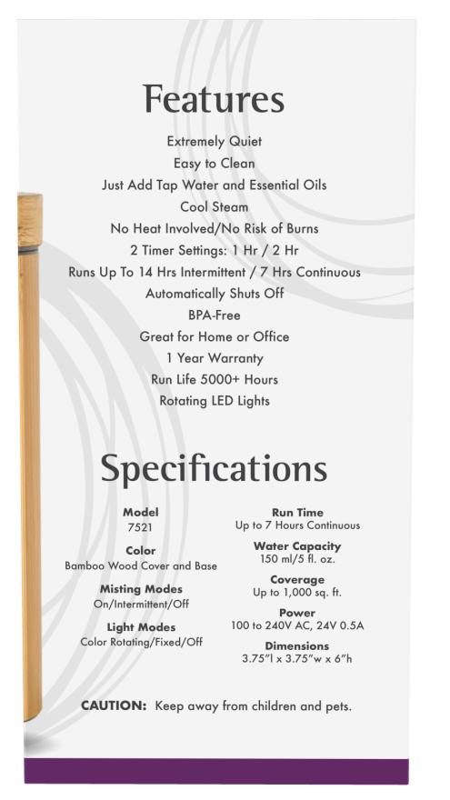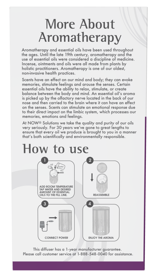 NOW® Solutions Real Bamboo Ultrasonic Oil Diffuser unites aromatherapy with modern scientific innovation to create an essential oil diffuser that's the perfect complement to your home or office. This attractive diffuser is BPA-free and utilizes high-frequency ultrasonic electrical vibrations to create an ultra-fine mist. This diffusion method doesn't utilize heat, which maintains essential oil integrity and holistic properties.